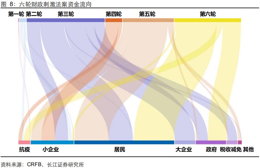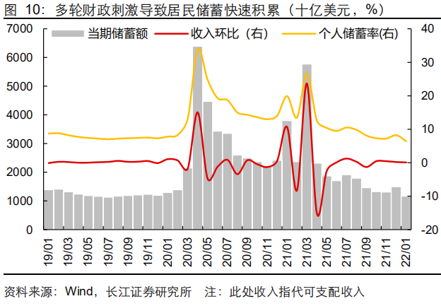 美国六轮5.7万亿美元的财政刺激使得大量资金流入居民部门,增厚了居民的储蓄,刺激了商品需求尤其是耐用品需求的回暖,房地产、汽车需求走高;