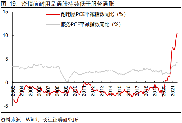 耐用品是其中最典型的例子,随着供需缺口的持续扩大,耐用品价格不断上涨,推动通胀上行。