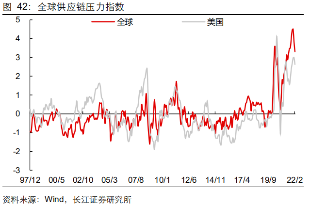 对应来看:第一,住宅、汽车分项压力仍高,但关键指标均已出现拐点。第二,服务需求正在快速修复,有望缓解商品供需不匹配导致的价格攀涨压力。第三,美国工业生产已经恢复至疫情前水平,制造业景气仍强,制约明显减弱。第四,运输仍是主要难点,供应链压力较大,航运拥堵情况仍待缓解。
