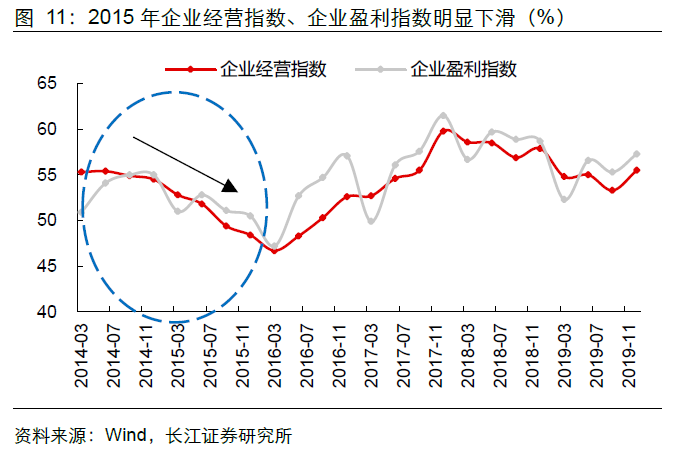 1、2015.12-2016.10,国内经济正处于产业结构转型期。在此期间的3次政治局会议(分别是2015.12、2016.04和2016.07)均强调“保持经济运行在合理区间”,而央行的核心任务则是“防止结构调整过程中出现总需求的惯性下滑”,“为经济结构调整与转型升级营造中性适度的货币金融环境”。2015年,受产业结构调整、传统产业去产能的影响,第二产业压力较大,工业增加值、工业企业利润、固定资产投资、企业经营和盈利指数等指标均出现趋势性下滑。