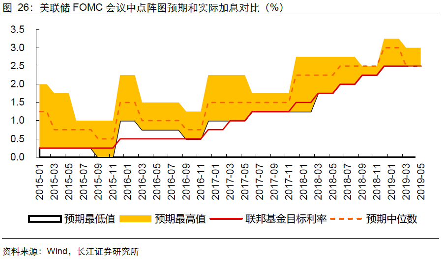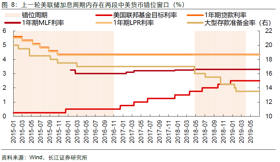 上一轮美联储加息的初期和后期,存在两轮中美货币错位窗口。对比2015-2018年美联储加息周期内国内货币工具的应对方式,我们可以将这段时间分为三段:1)2015.12-2016.10,中美货币错位,国内仍有降准和降息;2)2016.11-2018.04,中美货币同步,国内跟随加息;3)2018.04-2018.12,中美货币再度错位,国内开始降准,未有降息。