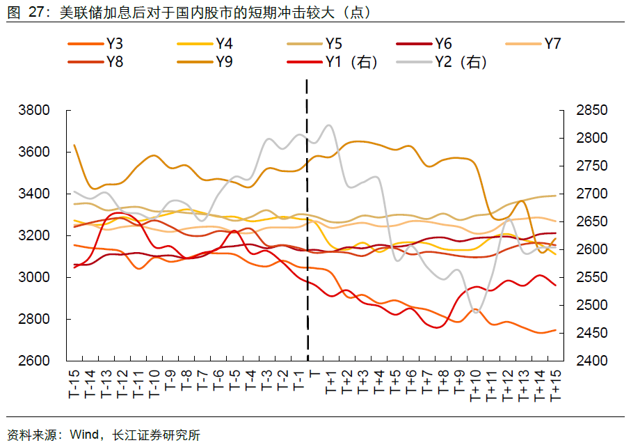 3、但值得重视的是,美联储加息对于国内股市的短期冲击仍然不容忽视。虽然影响国内股市走势的因素较多,美联储加息对于股市的影响并非长久、持续性的,但是短期冲击仍然值得重视。我们将上一轮美联储9次加息前后上证综指的走势进行对比,不难发现,加息后的15个交易日内,多数情况下上证综指出现下跌,且部分时间窗口在加息之前就有所反应。