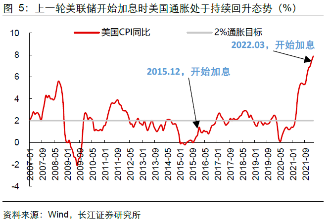 造成两轮加息起点节奏差异的核心原因在于就业恢复程度和通胀水平高低。一方面,从失业率来看,金融危机之后美国失业率历经多年才堪堪恢复至危机之前水平,2015年12月为5%,持平于2008年1月,而世纪疫情对于失业率的冲击虽然更大,但是却在较短的时间恢复至疫情之前的水平,2022年2月失业率为3.8%,与2020年2月的3.5%相差较小。另一方面,从通胀水平来看,抛开金融危机初期,其后通胀水平持续攀升,且超过2%通胀目标的时期集中于2011.02-2011.09,持续时间8个月,最高点为3.9%,反观本轮,自2021年3月起CPI超过2%,持续攀升至2022年2月的7.9%,创下近40年来的新高。因此,失业率已较快恢复,但通胀居高不下,是本轮加息来得更快更急的核心原因。
