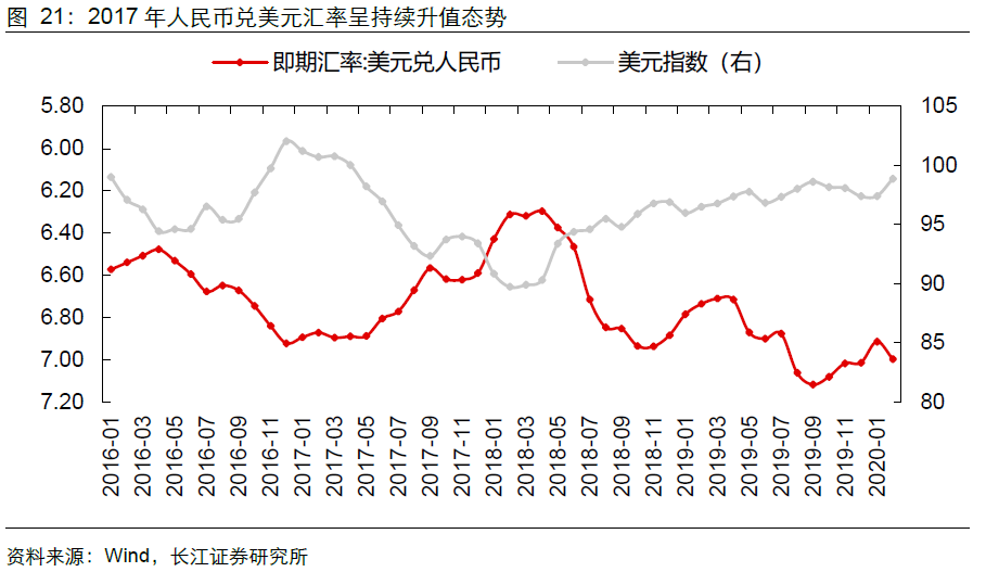 值得注意的是,随着我国货币政策跟随收紧,2017年前三季度,人民币兑美元汇率呈持续升值态势,从年初的6.9526一路升至9月初的6.4997,升值幅度高达7%。这也为2018年我国货币政策“以我为主”、不跟随加息创造了有利条件。
