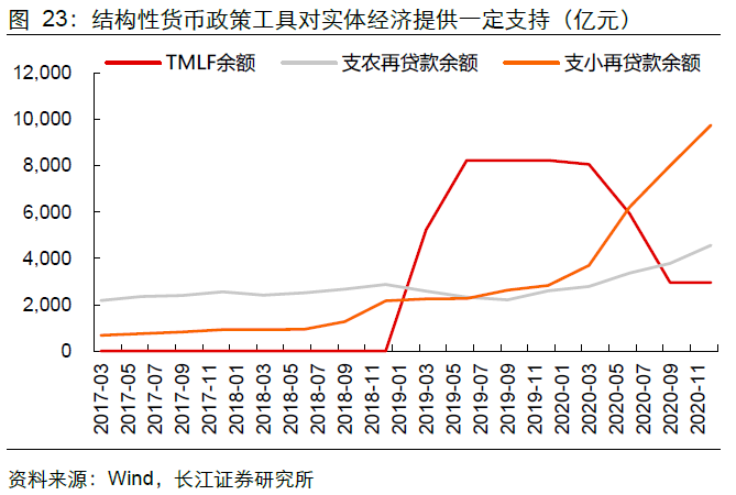 3)央行应对的货币政策工具在不断完善。从2014-2016年创设抵押补充贷款(PSL)支持棚改货币化,以及创设MLF弥补外汇占款减少导致的流动性缺口,到2018-2019年创设TMLF、创设CBS、增加支农支小再贷款额度等结构性货币政策工具支持中小微企业经营发展,央行货币应对方式从以总量型为主,转变为总量、结构型工具并重。