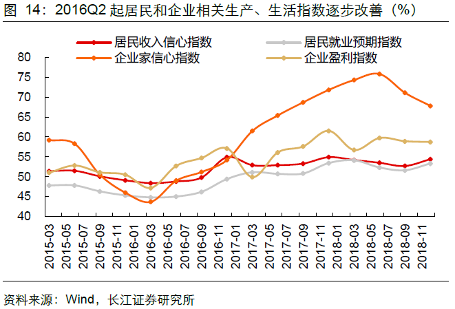 2、2016.11-2018.04,国内货币整体呈现跟随美联储加息的节奏,核心原因在于国内稳增长压力减轻,但面临资产泡沫问题,亟需货币收紧。自2016年二季度起,国内多项经济指标逐步向好,工业企业利润当月同比续升,企业家信心、盈利指数触底回升,居民收入信心和就业预期指数也持续改善。在2016年10月底的政治局会议上,未提“保持经济运行在合理区间”,并新增“注重抑制资产泡沫和防范金融风险”,意味着“防风险”取代“稳增长”成为首要目标。2016Q4央行货政报告对于经济的表述也调整为“中国经济下行压力减轻”,“稳定经济的有利因素逐步增多”,稳增长进程暂告段落。