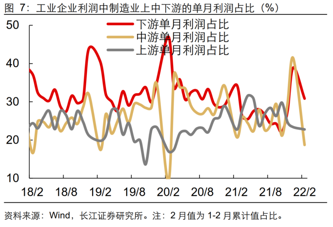 相较于工业整体的表现,1-2月数据中的结构性特征更为突出,上游利润明显走强,并明显抑制了下游企业的盈利能力。从利润占比来看,这一轮上游对下游的挤压明显强于去年三季度。