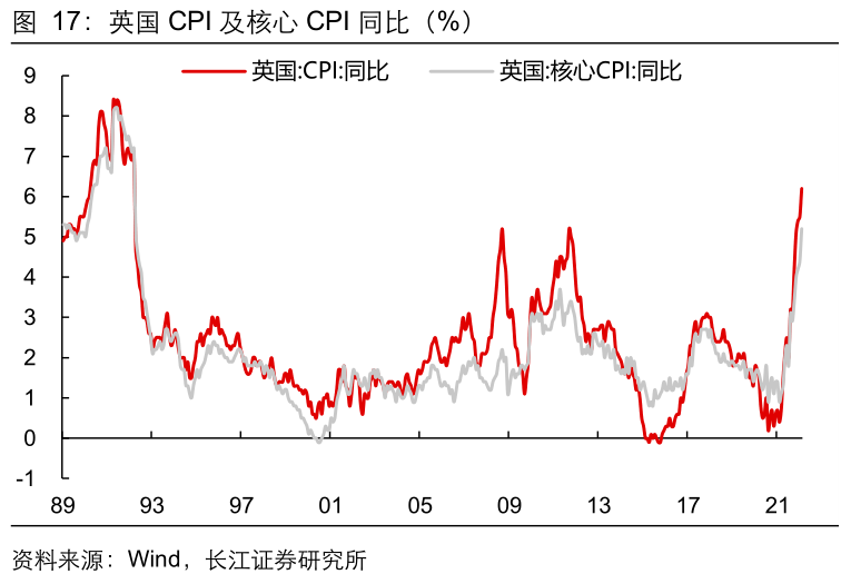 2)英国同样面临能源价格攀涨的考验,但与欧元区不同,由于价格稳定是英格兰银行的首要政策目标,为了应对持续走高的通胀水平,英国已经率先开始加息,12月以来已经将政策利率连续三次抬升,利率绝对水平已与疫情前持平。