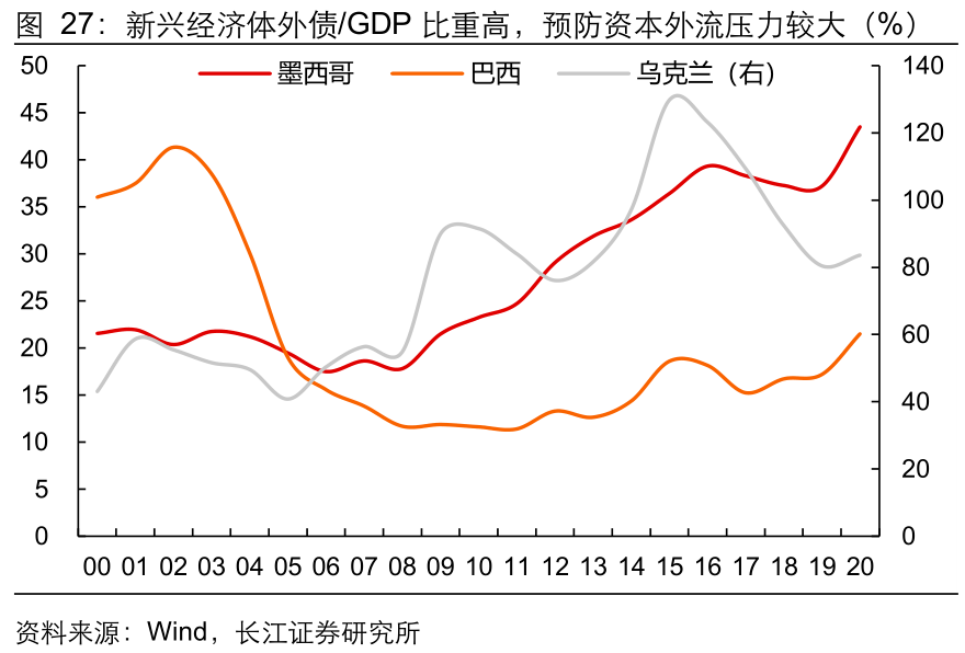 疫情对新兴经济体造成了重大打击。相较于发达经济体,新兴市场国家由于经济基础较弱、外债水平较高、货币贬值压力较大等因素,疫情对其造成的冲击相对更大,对这些国家的财政实力、医疗条件、工业生产均提出了考验。尤其是依赖服务、旅游或原材料出口的国家而言,疫情防控与经济增长之间的平衡显得尤为困难。2020年新兴经济体经济严重萎缩,实际GDP同比下降2.1%,创下有记录以来的新低。