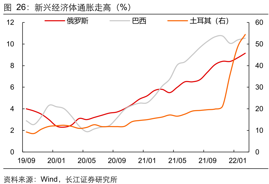 4)新兴经济体面对稳增长和治通胀之间的选择不同,中东欧、拉美、非洲等地区多国已经率先加息,亚洲地区在宽松环境下经济增速领先,经济增长出现分化。