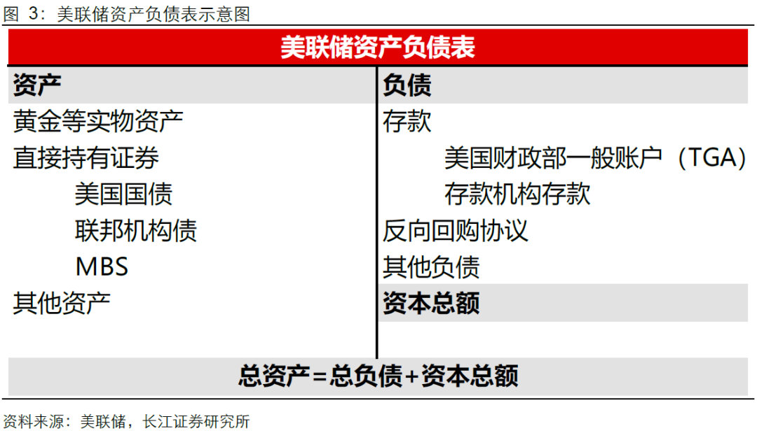 对于美联储的资产负债表而言,资产端最主要的是美联储持有的美国国债,约占总资产规模的六成以上,而负债端则主要是银行准备金、美国财政部一般账户(TGA)、隔夜逆回购工具等。货币正常化目标下,美联储将通过减少持有的美国国债和MBS规模来进行缩表,美联储从美国财政部收到支付的到期本金后,负债端的美国财政部一般账户(TGA)将对应减少,从而实现缩减资产负债表的操作。