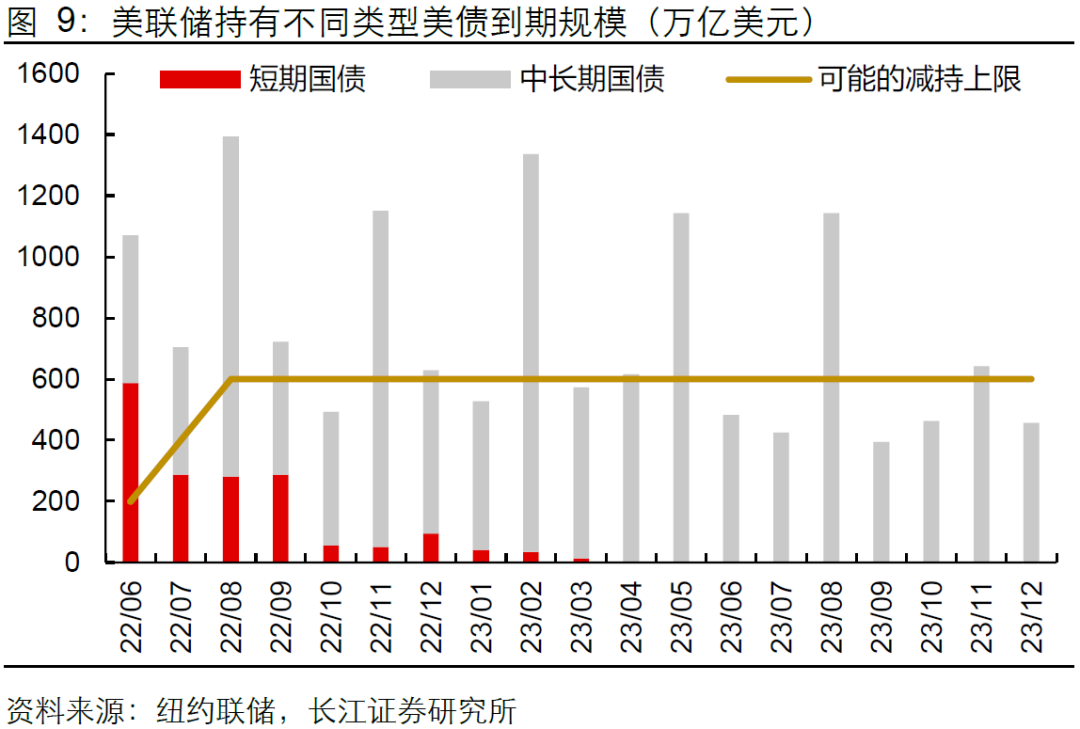 2、通过梳理美联储持有的未来到期国债和MBS规模,以及本轮缩表可能的缩表上限,我们推测缩表速度和幅度将明显快于上轮,整体节奏随着缩表上限逐月递增而呈现先缓后急的趋势。
