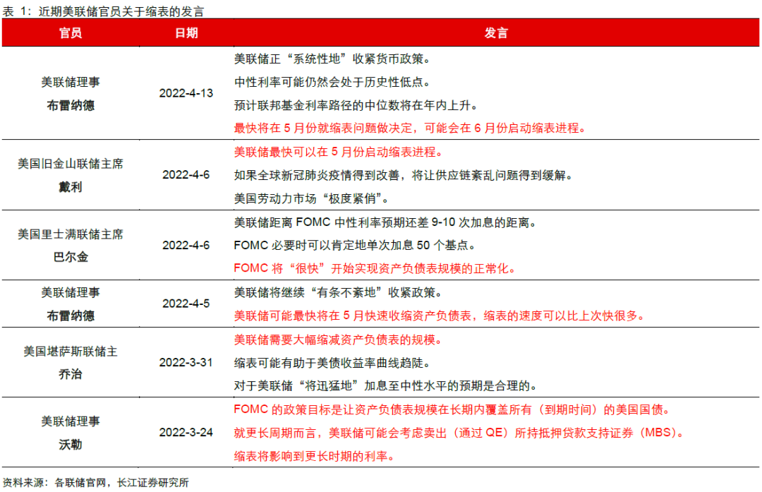 回顾本轮美联储关于缩表的讨论,自2021年12月FOMC会议纪要中提及缩表以来,美联储接连在1月FOMC会议上公布《缩表原则》,并在3月会议声明中预告将在接下来的会议上开始正式减持美国国债、机构债务和MBS。截至目前,美联储仍未确定具体缩表计划,结合近期美联储理事布雷纳德的表态,我们预计,美联储大概率将在5月FOMC会议上继续讨论相关细节并公布《附录》,6月正式宣布缩表。