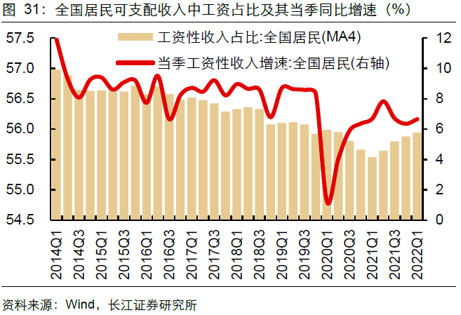 讨论居民支出决策的起点是收入。从收入情况来看,居民收入中的工资性收入占比不断抬升。一季度全国居民可支配收入(MA4)中,工资性收入占比抬升至55.9%。这反映出就业对于居民收入的基石性作用。