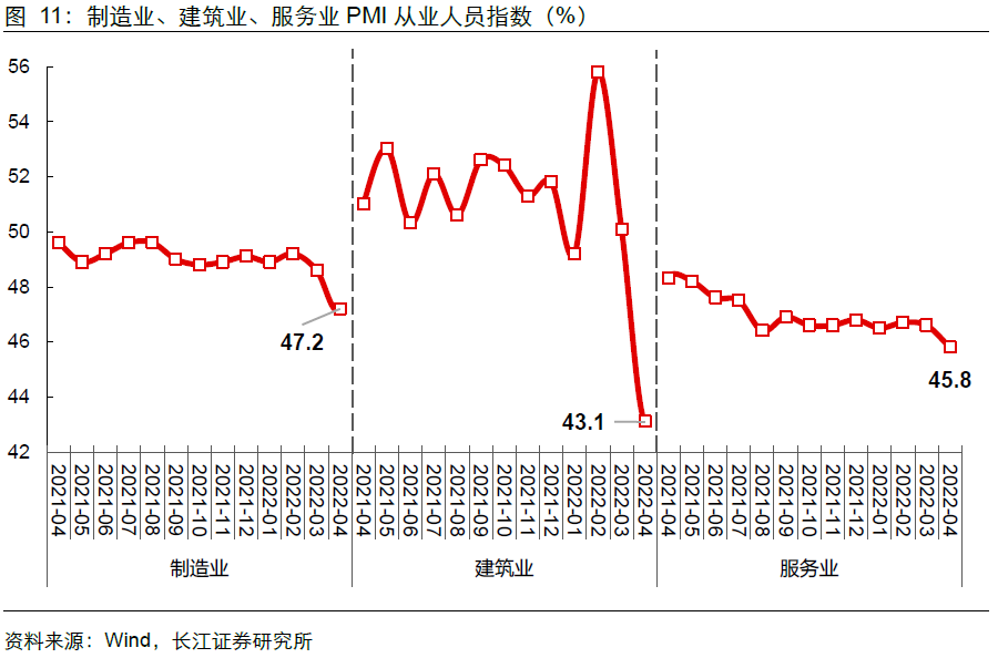 3)建筑业疫后就业规模持续没能回到疫情前水平,4月疫情冲击工地开工,导致土木工程用工环比大幅收缩;