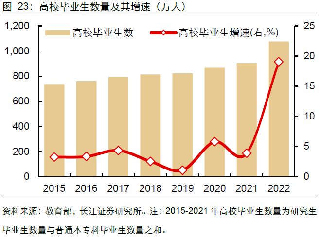 从供给来看,全国2022年高校毕业生数量约为1076万人,较2021年增长19.1%,为2015年以来供给绝对量最大也是增长最快的年份。