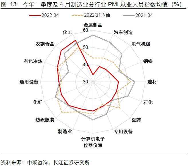 但进入4月后,从PMI从业人员指数来看,75%的行业4月用工环比表现弱于2021年同期,68.8%的行业4月用工环比表现弱于一季度均值,且用工规模处于收缩状态(低于50%)。