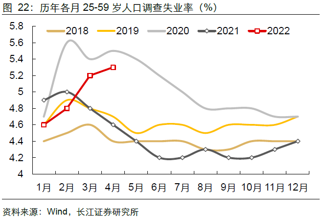 但更值得注意的是,就业压力已泛化到25-59岁人口。从历年经验来看,每年3月,25-59岁人口调查失业率会出现季节性回落。但今年受到疫情影响,3月、4月25-59岁人口调查失业率不降反增,逼近2020年同期水平。