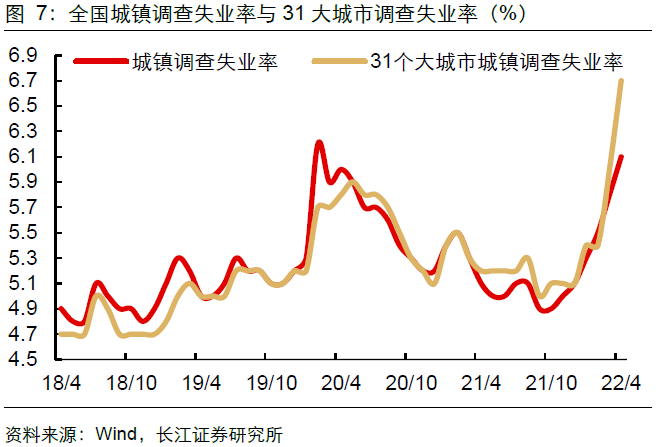 而从城镇调查失业率角度出发,就业压力明显集中在大城市,与2020年初的状况不同。4月31大城市调查失业率攀升至6.7%,连续两个月创2018年以来新高,且与全国城镇调查失业率的缺口不断扩大。从经验上看,城市在吸纳和承载就业方面较农村具有天然优势,然而上海持续封控,以及广州、苏州等地陆续出现散发疫情,显著削弱了大城市在一季度的就业吸纳能力。这与2020年初大城市表现好于全国整体的状况有所不同,或使得全国就业压力短期化解难度加大。
