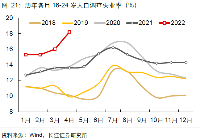 从去年三季度开始,16-24岁人口调查失业率持续高于历年同期,反映青年就业压力逐步显现。进入2022年,青年人群就业压力不降反增,4月16-24岁人口调查失业率录得数据以来最高值。