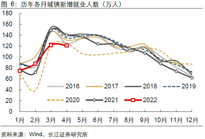城镇新增就业人数侧面印证劳动力需求不及往年。就业存在明显的季节性,在3、4月传统就业旺季,今年城镇新增就业人数表现明显弱于历年同期平均水平,4月数据更是低于2020年同期。这反映出今年3、4两月全国劳动力需求不及往年,劳动力市场吸纳就业的能力有所下降。