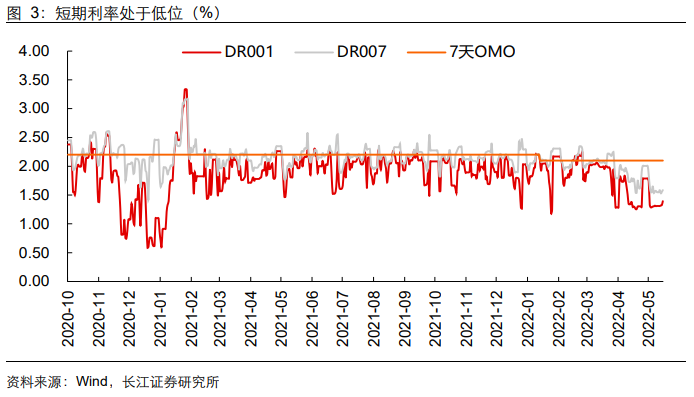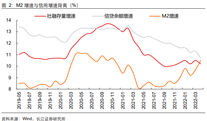 ①首先,从货币来看,2021年7月以来央行已进行3次全面降准(累计下调1.25pct)、1次下调MLF(10BP),截至5月中旬央行已上缴利润结存8000亿(相当于降准0.4pct),货币供应量已有明显提升,4月M2同比增速已攀升至10.5%,目前DR001、DR007处于1.4%、1.6%的较低水平,而7天OMO利率为2.1%,市场利率显著低于政策利率。但货币并未有效传导至信用,居民和企业信贷需求低迷,4月实体部门(居民+企业,剔除票据)新增贷款历史上首次转负。