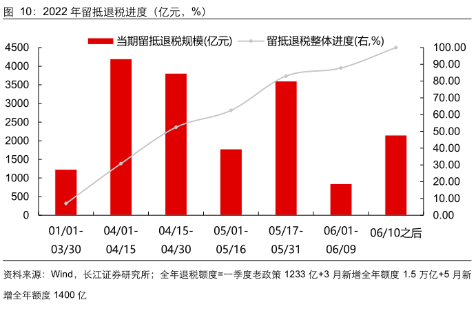 从实际退税节奏来看,4月、5月中下旬是大幅退税窗口,截至6月上旬已完成88%。一季度,财政部和税务总局继续实施此前已出台的增值税留抵退税老政策,共退税1233亿,这部分并不属于今年1.5万亿的新增额度。4、5月分别退税约8105、5385亿。截至6月9日,已有15483亿元退税款退到纳税人账户,退税进度达到88%,也就是说目前还有约2150亿退税尚未完成,占全年额度约12%。
