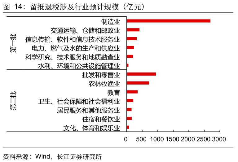 进一步的,根据《工业企业数据库》中披露的2012年制造业分行业企业留抵退税占比情况,且考虑到2018年已经退还新一代信息技术、先进轨道交通装备、节能与新能源汽车、电力装备、生物医药及高性能医疗器械等先进制造业的存量留抵税额,因此本轮制造业内部退税规模较大的行业或集中于化学原料及化学制品制造业,黑色金属冶炼及压延加工业,以及纺织业等行业。