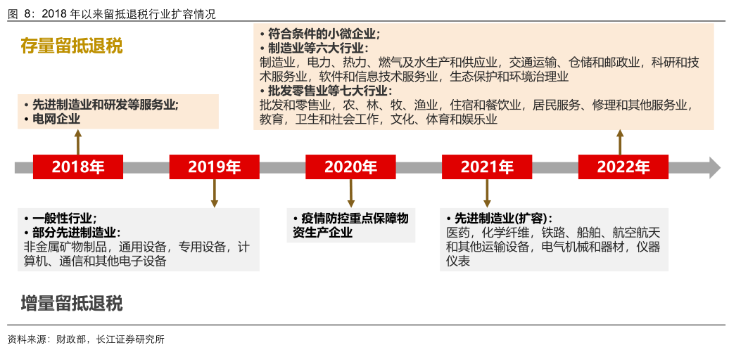 2022年,主要在存量退税行业进行扩容。存量方面,在2018年“先进制造业、现代服务业、电网企业”的基础上,新增“所有行业的小微企业、按一般计税方式纳税的个体工商户”,以及“制造业”、“电力、热力、燃气及水生产和供应业”、“交通运输、仓储和邮政业”、“科研和技术服务业”、“软件和信息技术服务业”、“生态保护和环境治理业”等六大行业。2022年6月7日,进一步拓展至“批发和零售业”、“农、林、牧、渔业”、“住宿和餐饮业”、“居民服务、修理和其他服务业”、“教育”、“卫生和社会工作”和“文化、体育和娱乐业”。
