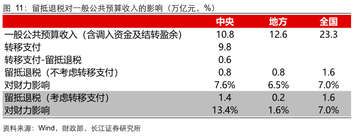 1、首先,留抵退税直接减少税收收入,影响实际财力。2022年留抵退税规模1.64万亿,占一般公共预算收入的7%。2022年3月15日财政部在2022年预算安排中预计全年留抵退税规模1.5万亿;5月30日,全国财政支持稳住经济大盘工作视频会议中提出预计新增留抵退税1400多亿元,今年出台的各项留抵退税政策新增退税总额达到约1.64万亿元。而今年全国一般公共预算收入23.34万亿(含调入资金及使用结转结余),占比约7.0%,预计对于全国一般公共预算收入增速的拖累在7.7pct。