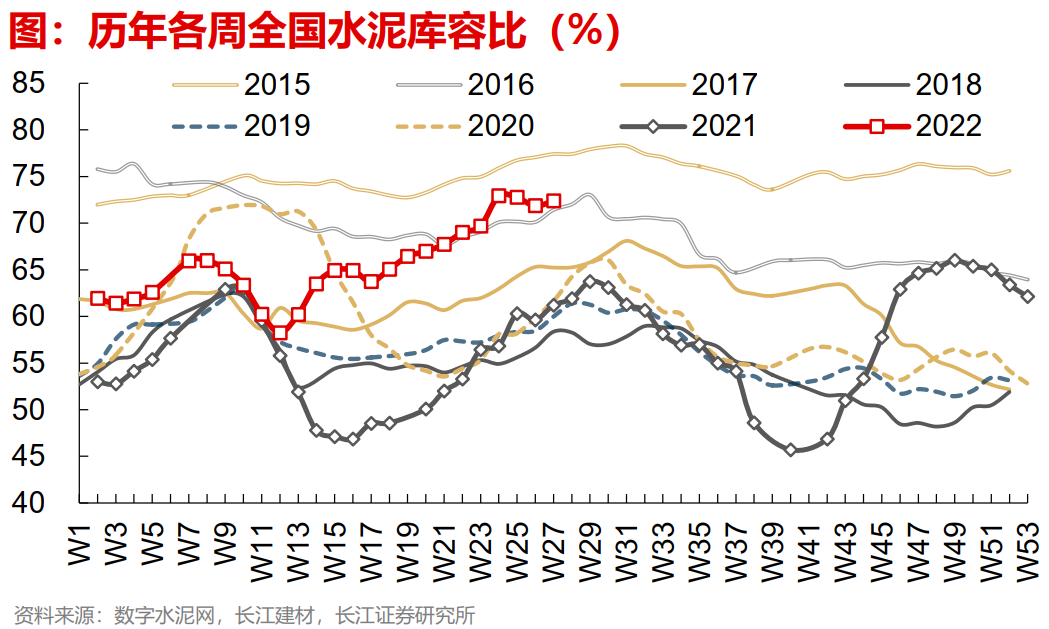 水泥:天气多变不利于施工,企业降价支撑现有需求。上周雨带北移,使得区域水泥产销格局有所变化。华南雨季暂告段落,建筑施工需求恢复,带动水泥出货量明显回升。而云南、湖北、山东等地迎来降雨,建筑企业开工减少,使得水泥出货略显困难。需求偏弱而天气多变,使得水泥企业跨行政区销售行为增多,且多以降价促销为主,带动上周全国水泥价格降至429.2元/吨。而从库存来看,当前水泥库容比反弹至72.4%,企业去库压力仍大。