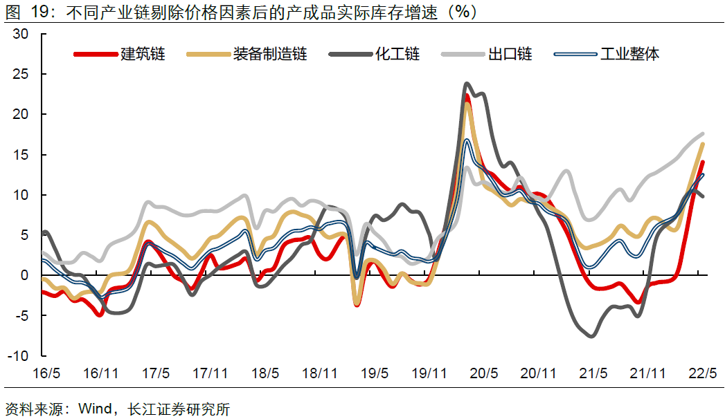 从产业链视角来看,出口链对名义产成品库存增速的贡献明显高于其他产业链。就2022年5月而言,出口链上的13个行业对工业产成品库存增速的拉动率为13%,贡献率为65.9%。对照化工链和装备制造业的拉动力来看,2021年二季度之前,出口链的拉动力主要由装备制造链(含汽车)支撑,而2021年二季度及以后,出口链拉动力的上抬或是化工相关行业带动的(化工纺服链)。
