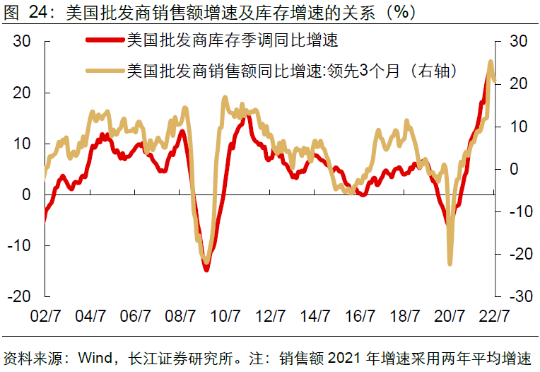 从历史经验来看,美国批发商销售增速的拐点领先美国批发商库存增速3个月左右,而销售增速已在4月拐头向下。这或许意味着,美国批发商库存增速或在7月开始走弱。