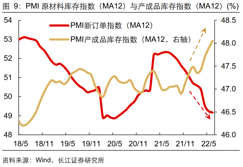 反映出“企业产销不畅,生产、进货积极性较弱”的现象。从PMI 数据来看,在产成品