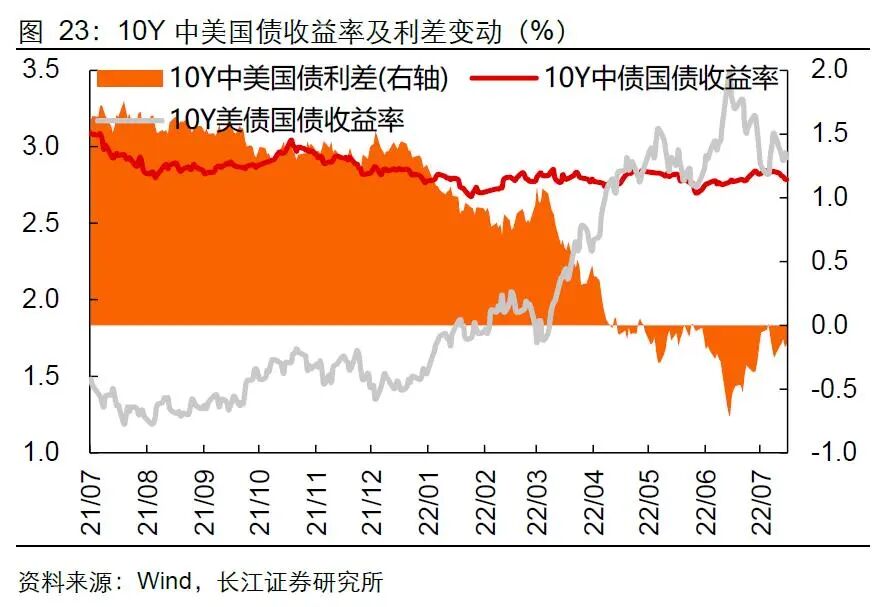 最新一周(7月11日-7月15日)人民币兑美元汇率贬值,美元指数回升,中美国债利差倒挂、环比走阔。离岸、在岸美元兑人民币汇率周均值分别回升至6.7421、6.7348。美元指数周均值回升至108.21。10Y中美国债利差周度均值为-15BP,环比-4BP。