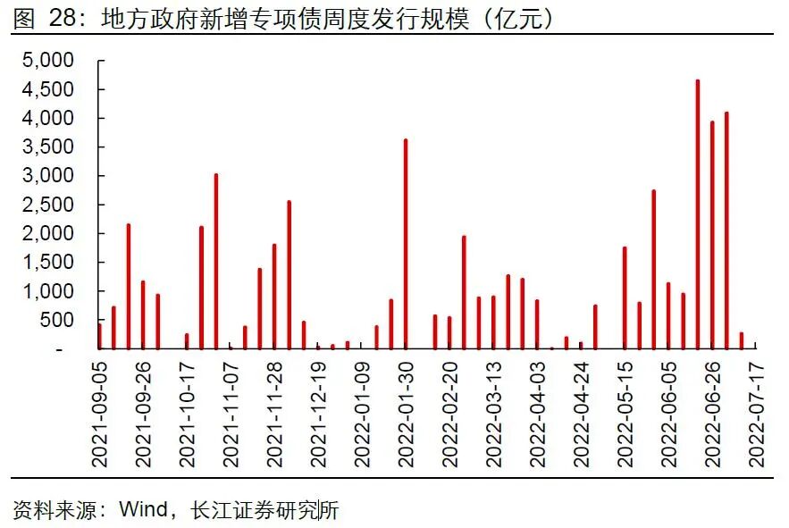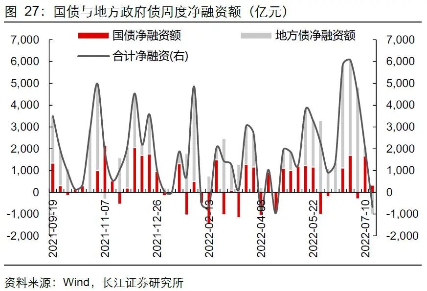 最新一周(7月11日-7月15日),国债与地方政府债合计净融资-684亿,环比减少2725亿。具体来看,最新一周国债发行2364亿、净融资325亿;地方政府债发行569亿、净融资-1009亿,其中发行再融资一般债券427亿,再融资专项债券143亿。下周约有194亿新增专项债待发行。