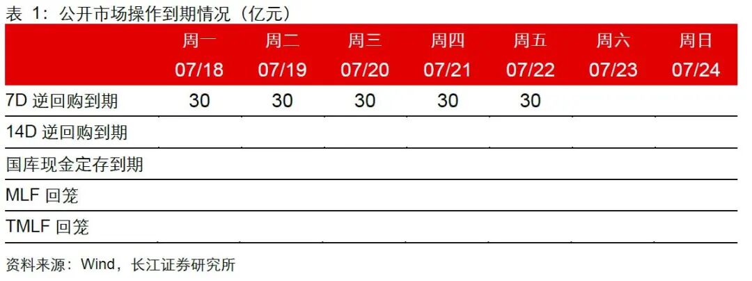 最新一周(7月11日-7月15日)央行公开市场净投放400亿元。其中,开展150亿元逆回购操作,150亿元逆回购到期,逆回购层面净投放0亿元;此外,MLF投放1000亿元,MLF回笼1000亿元,国库现金定存400亿元。