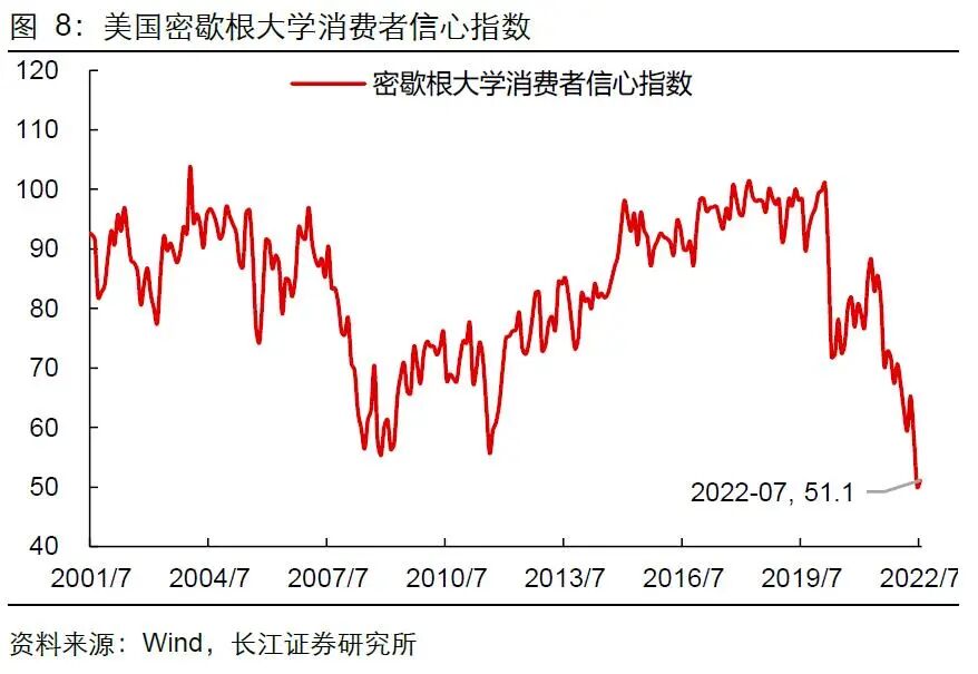 美国消费者信心低位反弹。7月密歇根大学消费者信心指数初值回升至51.1,高于市场预期值及6月终值50,意味着消费者需求有所回升,但仍然处于历史低位水平。分项来看,消费者预期指数由47.5下降至47.3,现状指数由53.8上升至57.1,均超出市场预期,表明消费者对经济现状的信心在边际上有所恢复。总的来说,美国消费者信心回升反映消费者对于经济的预期或已触底,但在当前通胀仍然高企、美联储大幅加息概率较高的背景下,消费者信心短期内或仍处于低位。