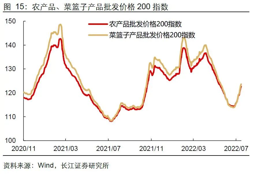 猪肉、菜、果价格均抬升。从高频数据来看,最新一周(7月11日-7月15日)猪肉、28种重点监测蔬菜、7种重点监测水果平均批发价周均值较上周均值分别上涨8.7%、5.8%、1.1%。农产品和菜篮子批发价格指数周均值均抬升,较上周均值分别抬升2.9%、3.4%。