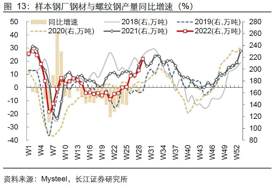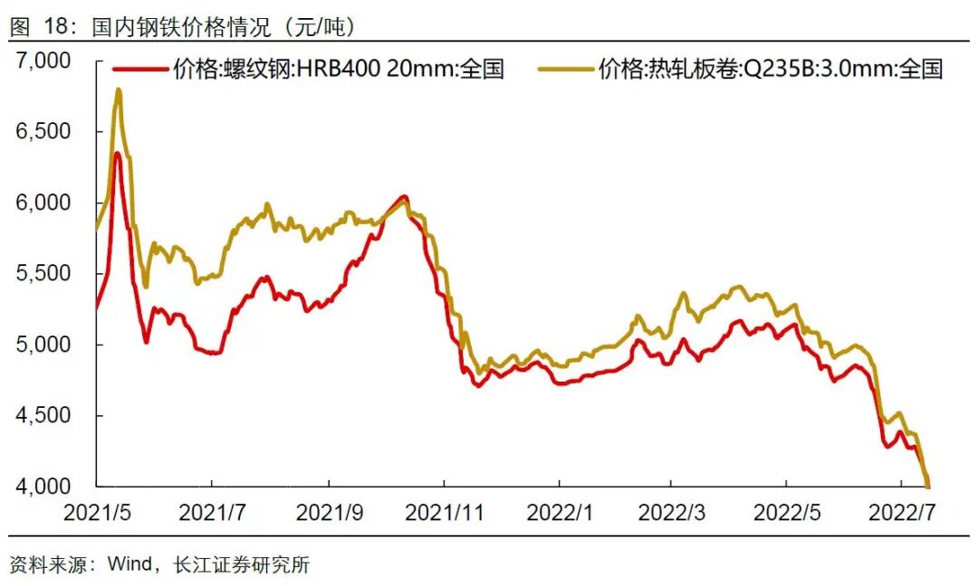 发电耗煤增速由负转正,样本钢厂钢材产量降幅扩大。7月11日-7月14日,沿海八省电厂发电耗煤单周均值同比增速由负转正至0.3%,较上周上抬4.9pct。最新一周(7月15日当周)高炉开工率续降至77%,高于去年同期。产量方面,最新一周(7月15日当周)Mysteel样本钢厂钢材总产量同比降幅扩大至16.4%,其中,螺纹钢产量同比降幅扩大至30.8%。此外,最新一周(7月15日当周)螺纹钢、热轧均价双双续降,钢材社会库存总量去化放缓,反映钢材需求边际走弱。