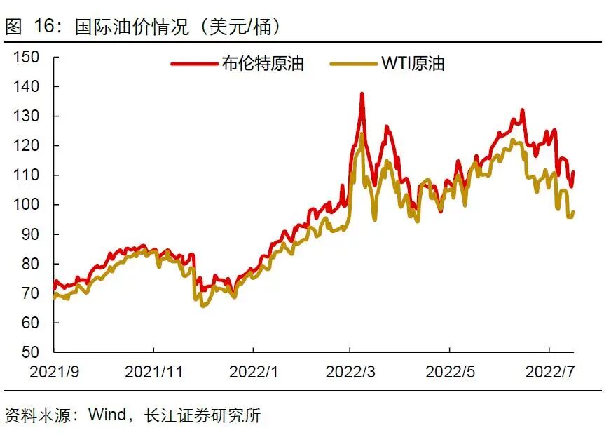 油、煤、钢价格均回落。从各项高频指标变动趋势看,最新一周(7月11日-7月15日)Brent油价和WTI油价均值较上周均值分别下跌5%和5.1%。秦皇岛山西产Q5500动力煤平仓价、螺纹钢、热轧板卷最新一周价格均值较上周均值分别下跌0.2%、4.4%、6.9%。