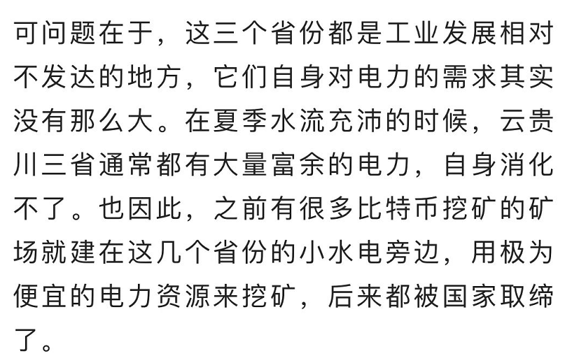 关键是,云南贵州四川的工业不发达,所以多余的电用不了,原来还可以挖比特币,现在比特币也不让挖了。