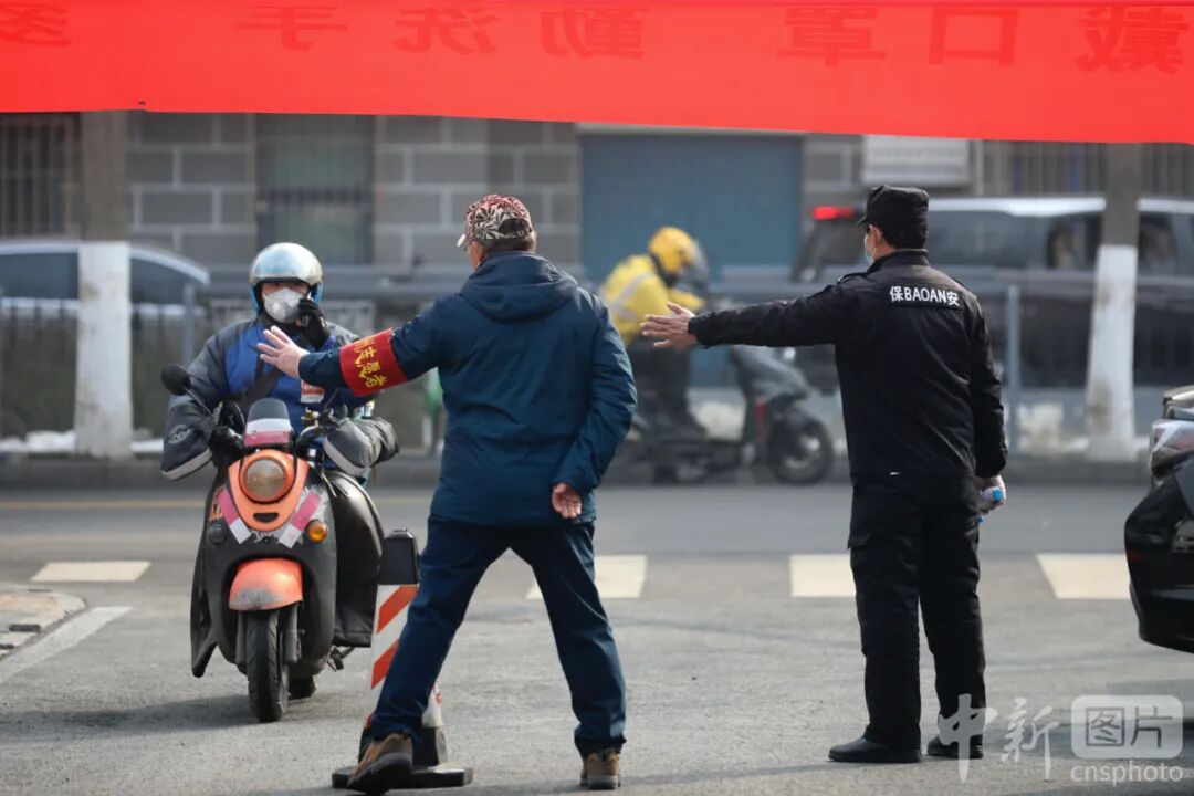 2月12日,北京通州区玉桥街道玉桥南里南社区,工作人员对准备进入社区的快递人员进行劝阻。