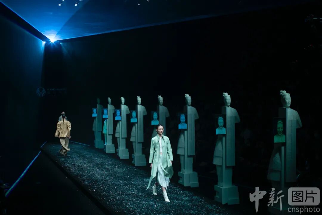 10月31日,2021春夏中国国际时装周,模特在设计独特的T台上展示时装。