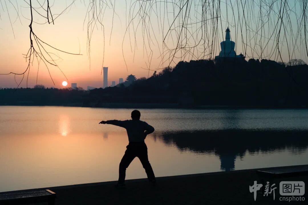 3月7日,北京北海公园,市民在水边晨练。