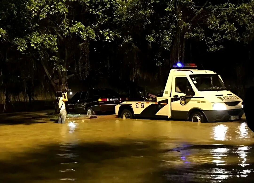 ▲朱柳融拍摄洪水来时交警拖离沿岸被水淹车辆。