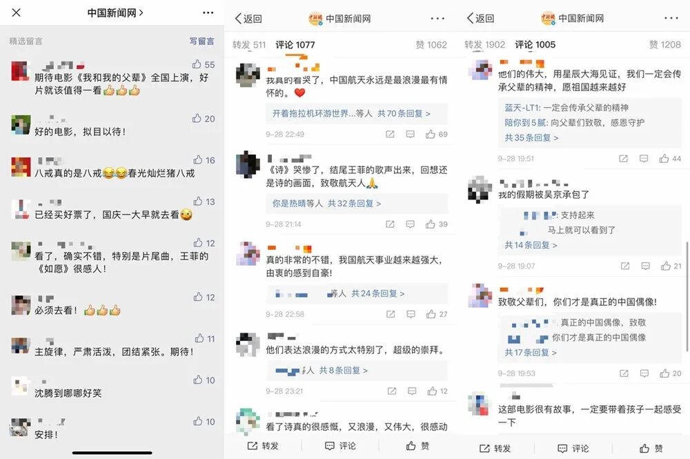 比如《我和我的祖国》《悬崖之上》《我和我的父辈》等片都是以小人物小切口开始,写人、写人性,讲述普通人与时代的故事。这也是为什么,越来越多的新主流电影能得到观众的共鸣。在《我和我的父辈》全网评论中,“值得看”、“感动”成为被提及最多的热词。![]()