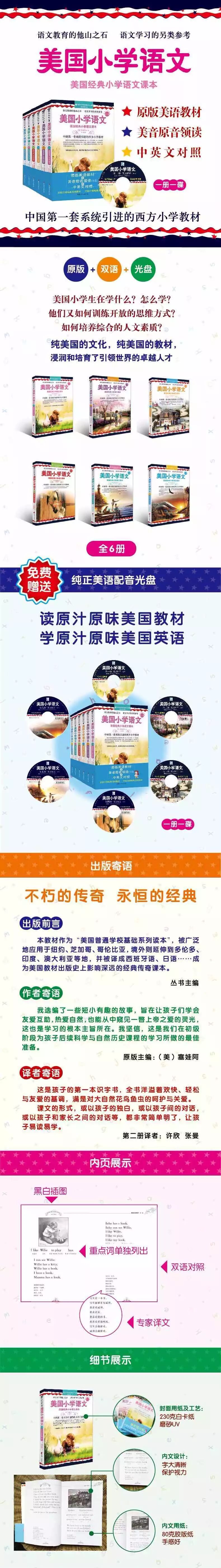 《美国小学语文:美国经典小学语文课本(套装1-6册)》为19世纪末到20世纪上半叶跨世纪的美国小学语文原版教材。它在很长一段时间内,作为“美国普通学校基础系列读本”,被广泛地应用于加利福尼亚州、波士顿、纽约、芝加哥、圣弗朗西斯科、哥伦比亚等全美各州,并延伸到境外,如多伦多、印度、澳大利亚、新西兰、菲律宾等地。成为美国历史上横跨两个世纪、使用范围广、使用人数多的美国小学语文教材。