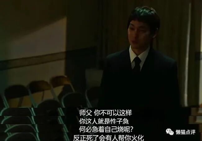 就像结尾处在师父的灵堂前,北野武一边难过,一边开玩笑调侃着师父的意外死亡。明明悲从中来,却又让人哭笑不得。