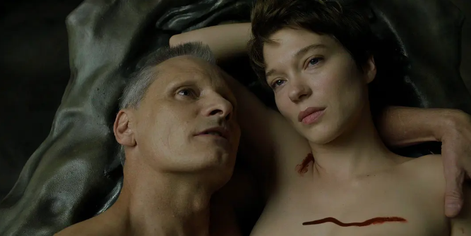 在众目睽睽的秀场,蕾雅·赛杜指挥着镭射的激光将莫滕森的身体切开,袒露出他的内脏,收获着他变异的器官。